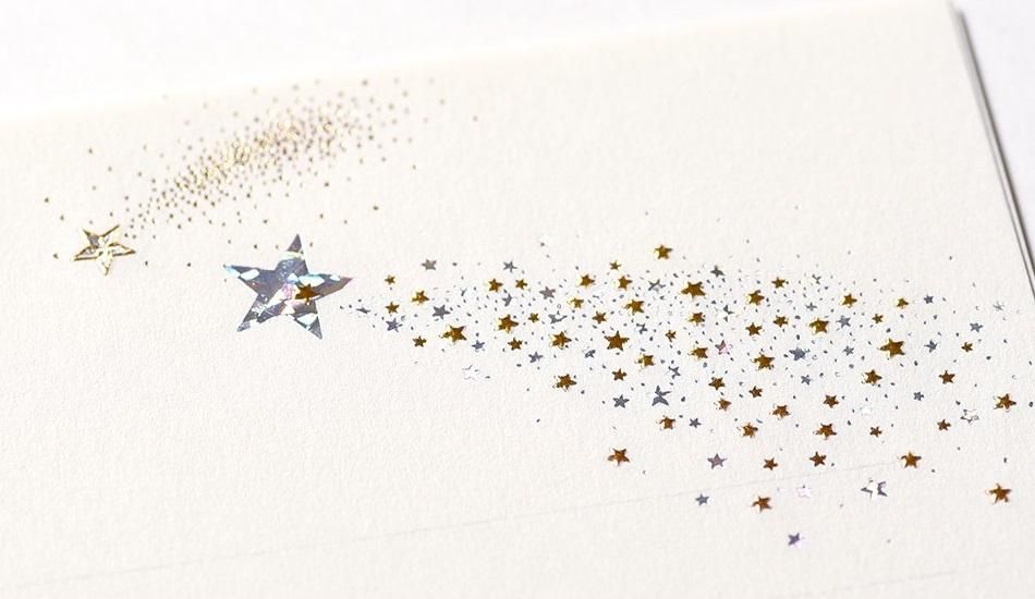 また、エンボスと同様に、素材に高級感や上質感を意匠できる特殊加工が箔押しです。金箔やホログラム箔などを熱転写する箔押し加工は、まるで本物の金属がそこにあるかのような箔押しの質感を与えます。その特別感は“高品質の保証書”と言わんばかりです。それゆえに、昔から豪華本の装丁や高価な香水の化粧箱などに利用されてきました。“目立たせる”目的だけでなく、“伝統的で高級”なイメージを表現する時にぴったりの加工です。
