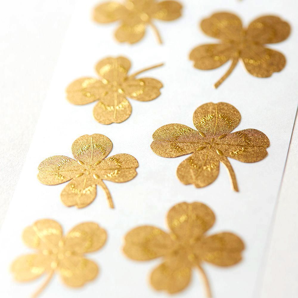 四葉のクローバーが異なるゴールド色の印刷加工でシックに表現されたシールです。