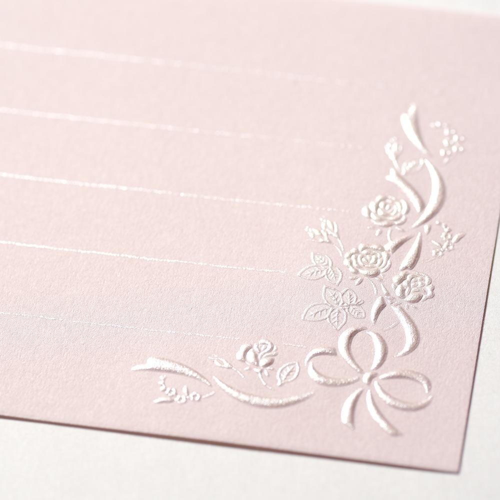シックなローズピンクの紙色にリボンと薔薇を組合わせ、浮出し加工を施したエレガンスなデザインです。