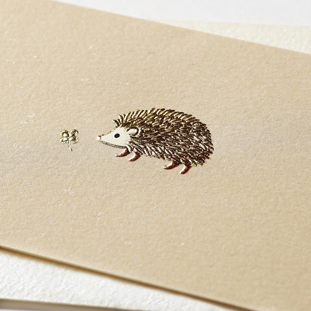 ヨーロッパをはじめ日本でも人気のハリネズミに四葉のクローバーを組み合わせたデザインです。