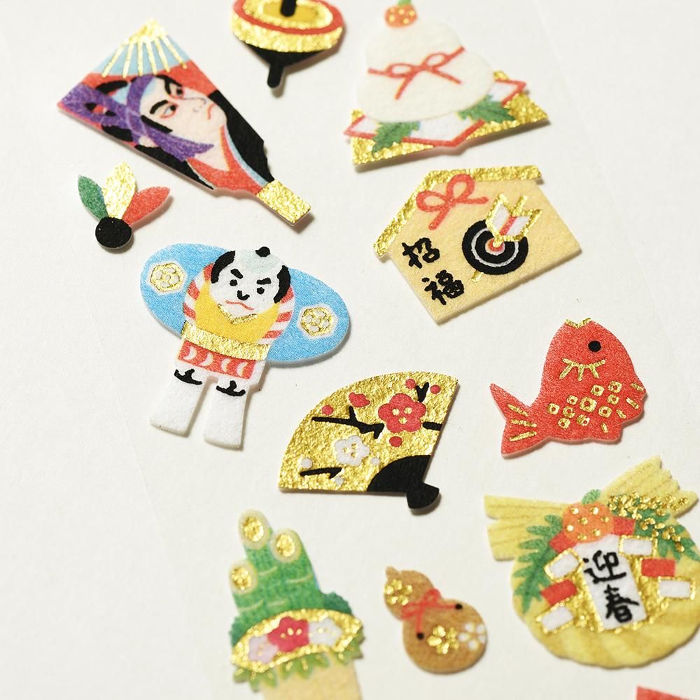 お正月らしいモチーフをたくさん集めた見た目もにぎやかなシールです。