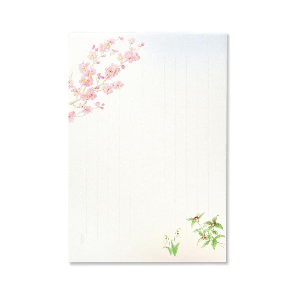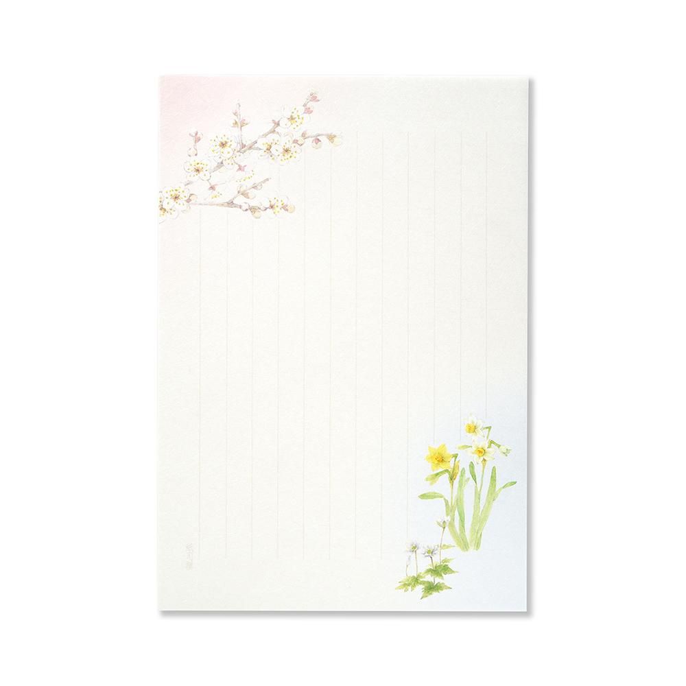 ウメ、スノードロップ、センリョウ、スイセンが描かれています。