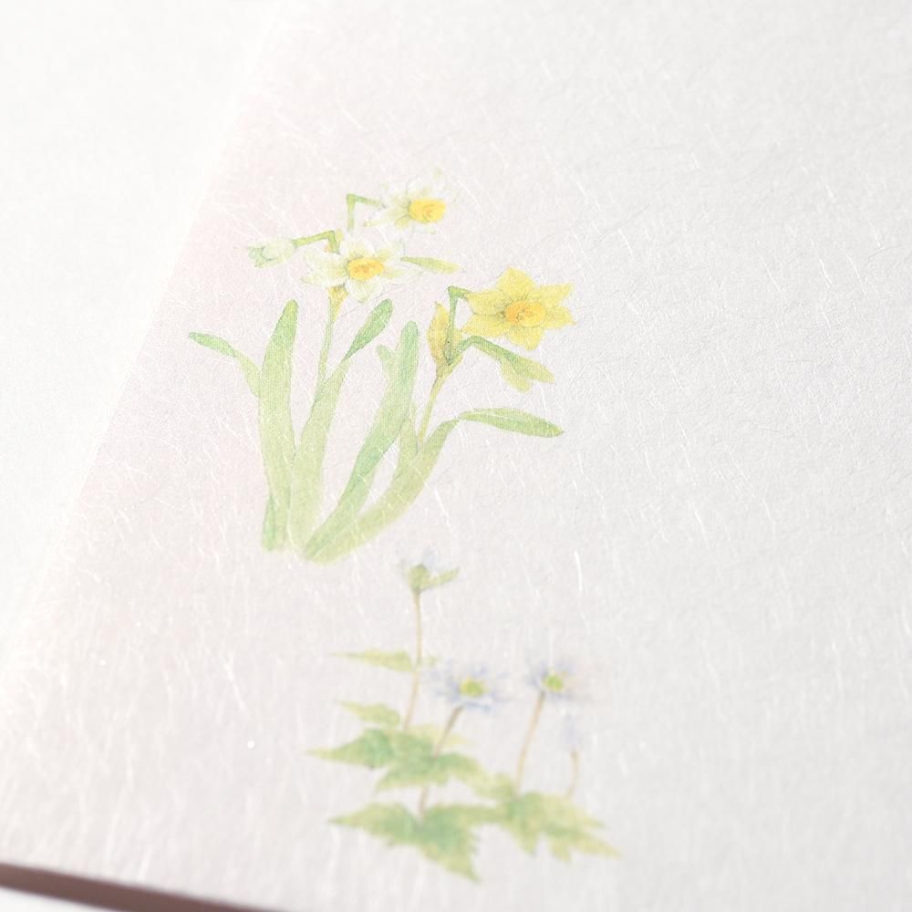 ウメ、スノードロップ、センリョウ、スイセンが描かれています。