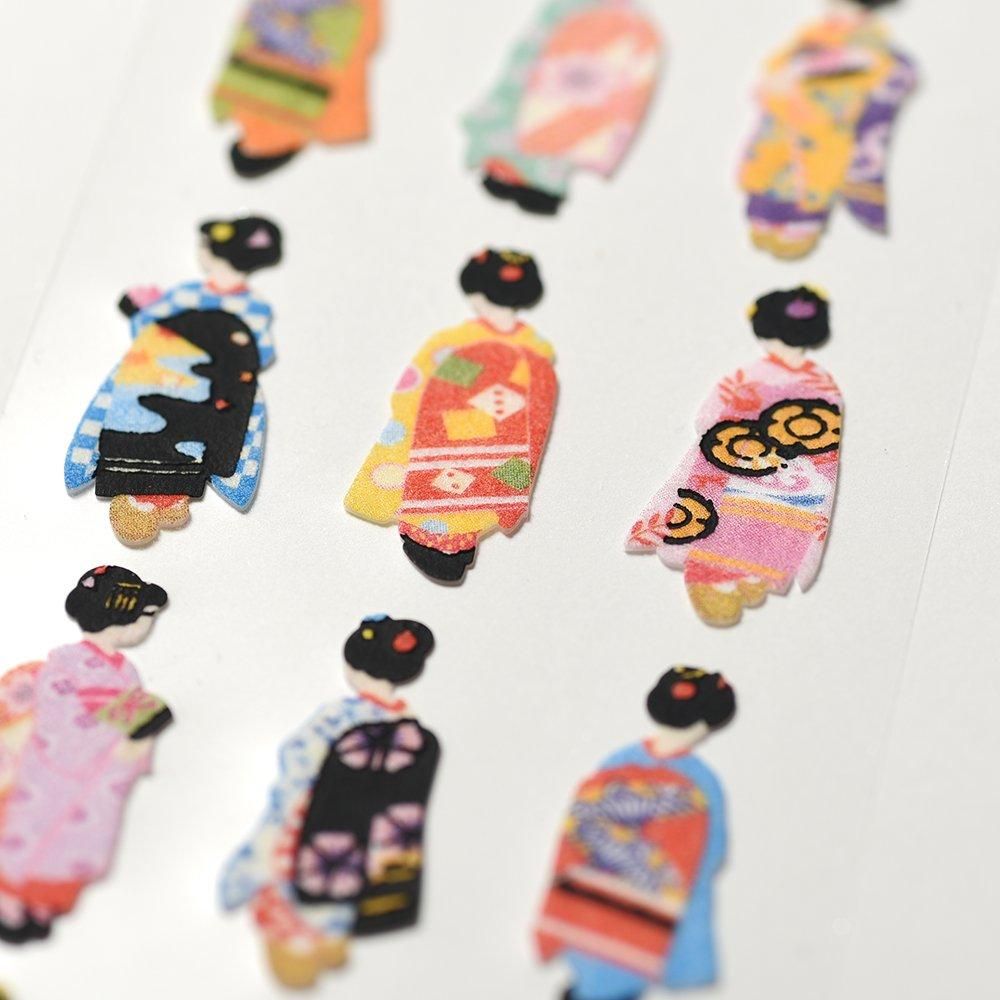 はんなりと京都の街を歩く舞妓さんの着物姿をデザインした、可愛らしく華やかなシールです。