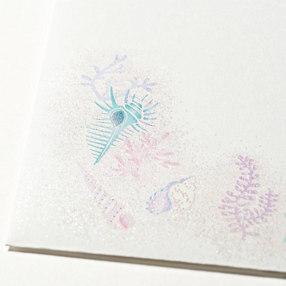 波によって砂浜に運ばれてきた巻き貝や二枚貝、珊瑚などがモチーフのデザインです。