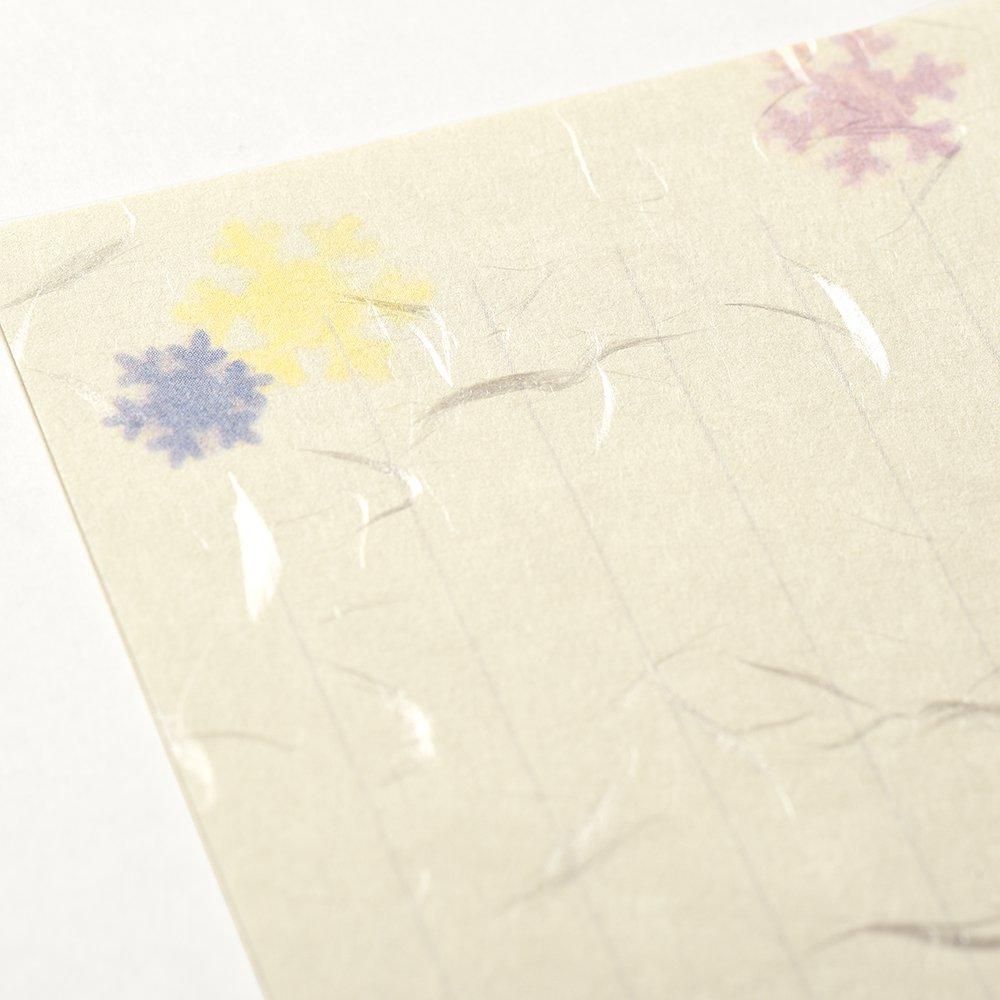 空から舞い降りる雪の結晶がカラフルな和紙で表現され、温かみの感じられるデザインです。