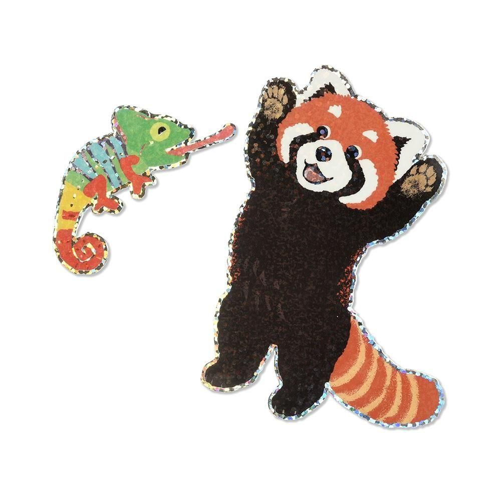 「ほのぼのなかま」のデザインからレッサーパンダとカメレオンの不思議な組み合わせのステッカーです。